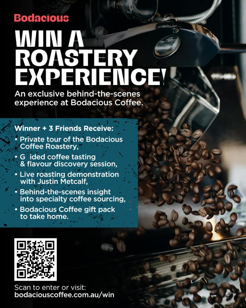 Go into the draw to win an exclusive behind-the-scenes experience at Bodacious Coffee with coffee expert Justin Metcalf. Discover how specialty coffee travels from farm to roaster to cup. Watch a live roasting session, taste freshly roasted coffee, and learn the secrets behind flavour, origin, and roasting.